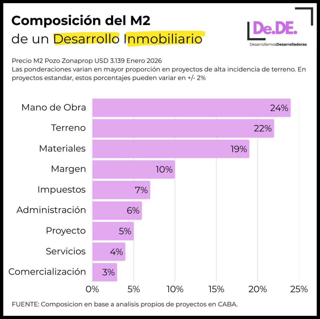 En un contexto donde la rentabilidad de los desarrollos inmobiliarios se encuentra bajo presión, entender cómo se compone el valor del metro cuadrado en pozo se volvió clave para evaluar la viabilidad de nuevos proyectos. Un reciente análisis elaborado por Santiago Vitali, fundador de De.De. – Desarrollamos Desarrolladoras, aporta una radiografía actualizada de los costos que explican el precio final de una obra desde su etapa inicial.