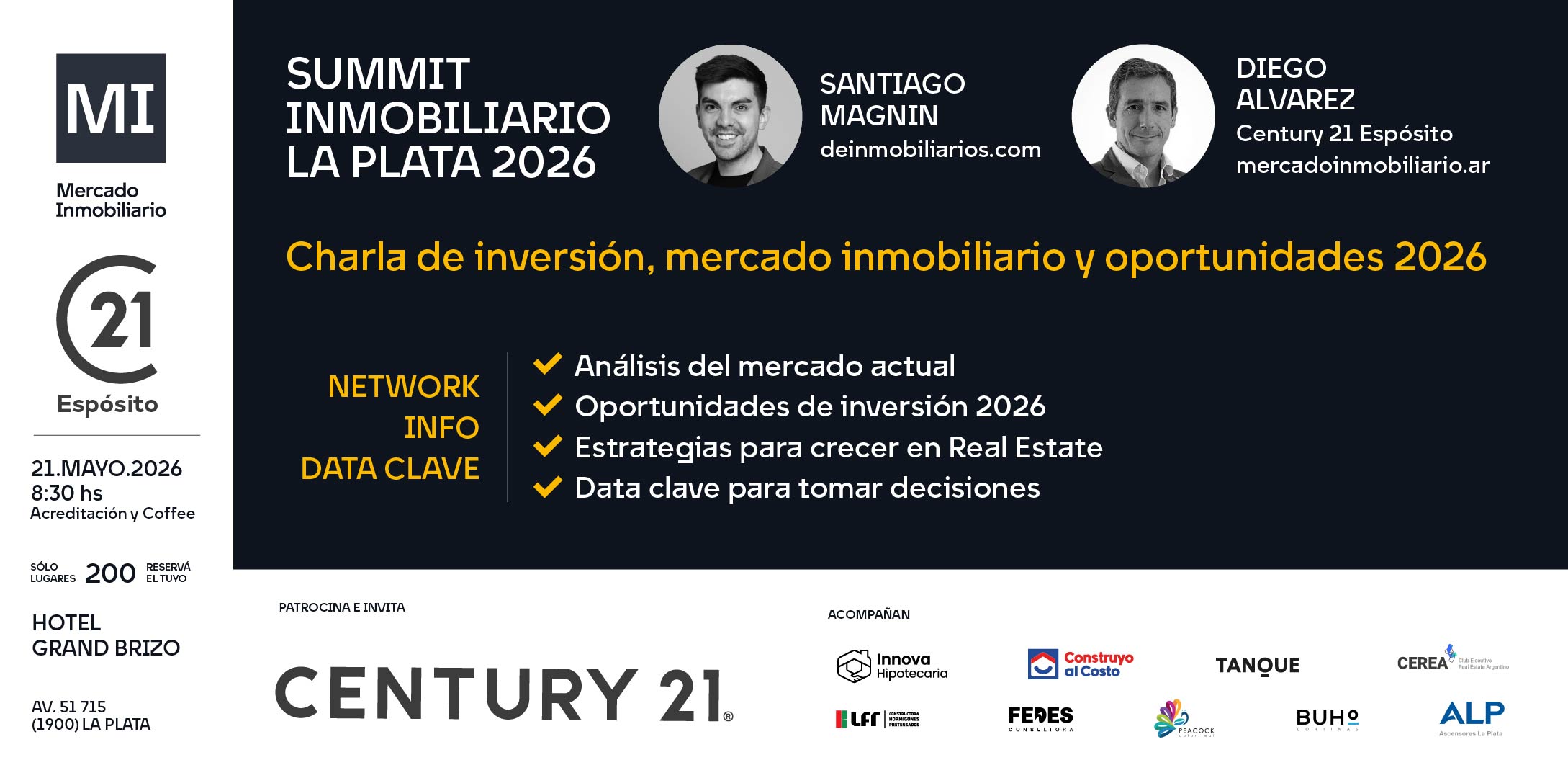 El evento contará con la participación de Santiago Magnin, de deinmobiliarios.com, y Diego Álvarez, de Century 21 Espósito y mercadoinmobiliario.ar, quienes compartirán su visión sobre el presente y el futuro del sector inmobiliario.